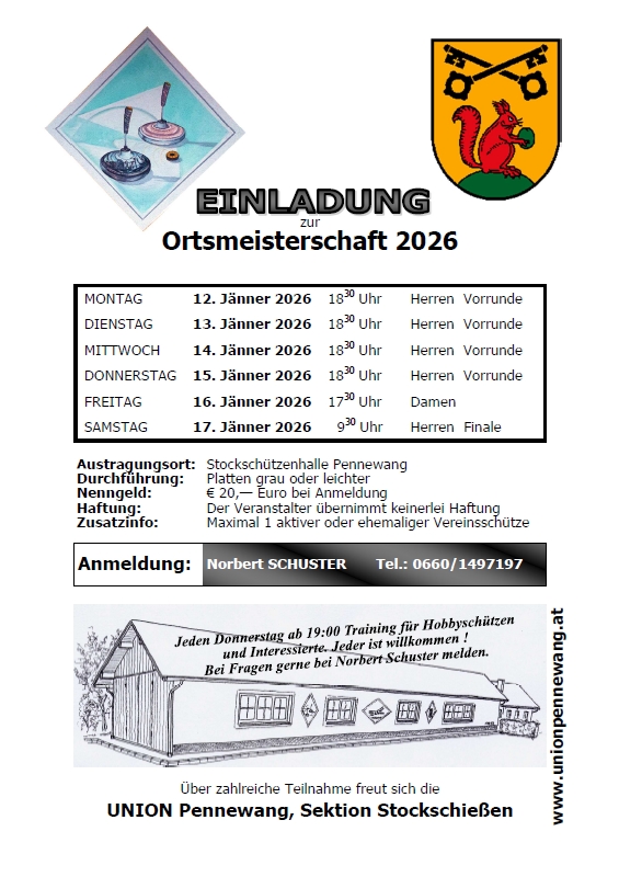 Die Union Pennewang, Sektion Stockschützen, lädt wieder zum Herbstturnier ein. Auch heuer wieder ein Tag für unsere Hobbyschützinnen und Hobbyschützen. Das Turnier findet von 22.- 24. September statt, Beginn ist jeweils um 18:30. Auch Besucher sind sehr herzlich eingeladen, für das leibliche Wohl ist gesorgt. Auf euer Kommen freut sich die Union Pennewang.